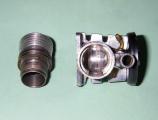The piston and con-rod were both of hardened steel. The con-rod engaged with the piston through a ball-and-socket bearing at the upper end, the ball section of the rod being retained in place by a small circlip placed internally around the open end of the socket.