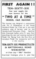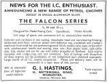 This venture was clearly a labor of love for Hastings—whatever his other failings, he appears to have been a genuine enthusiast. He was quite energetic in promoting the company, placing regular advertisements in specialist publications (notably Model Engineer, Model Cars and Model Car News) from early 1946 to mid 1950 extolling the virtues of the company's various products in fulsome terms. Interestingly enough, the first few advertisements, in which the introduction of the Falcon series in 5cc, 10cc and 15cc models was highlighted, were taken out under the name of GI Hastings of 26 Battenhall Road, Worcester, with no mention of Ten-Sixty-Six Products. Subsequent advertisements all used the Ten-Sixty-Six name.