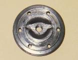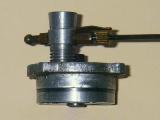 The steel portion of the disc has a 1/4" O/D. bronze bush pressed into its centre. The backplate is centrally drilled and tapped 4BA to accept a similarly-threaded extension of the 3/16" dia. rotor spindle, which has a 5/16" dia. head to retain the disc. The threaded end of the disc mounting spindle protrudes through the backplate at the rear and is slotted at the end to allow for adjustment of the disc clearance. The assembly is completed by the addition of a shouldered locking collar which is internally threaded 4BA and threads onto the protruding end of the disc mounting spindle to serve as a lock-nut.