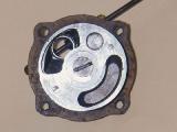 Now it's off with the front cover, which is again secured by four very sturdy 4BA steel slot head screws. Once again, a paper gasket is used to ensure a seal. The timer is clamped to the front bearing housing in the conventional manner and is now easily removed. It proves to be not without interest itself, being a quite sophisticated and complex unit which employs a plunger-type cam follower to lift the contact arm at the required moment. Coarse adjustment of the point gap is achieved in the usual way with the fixed contact being threaded into the timer casting and secured by a lock-nut. Adjustment of this contact requires the removal of the timer. But there's also a fine adjustment which does not require timer removal. The points are mounted on a separate cast arm which is pivoted at one end on the main timer casting and is secured at the other end by a set screw which acts through a short crescent-shaped slot. By loosening the set screw and rotating the point mounting arm on its pivot, a degree of point gap alteration can be achieved. Once again, very neat indeed! A point gap of .006" to .008" was recommended by the manufacturers.