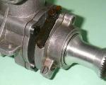 With the head and front housing off, it's now possible to remove the piston assembly through the top of the liner. The lightweight alloy piston proves to be very similar to its McCoy equivalent, with a high contoured crown which incorporates a baffle. The piston features two skirt ports on the transfer side which align with two holes in the lower cylinder liner at bottom dead centre, thus aiding the bypass process as well as promoting improved piston cooling and lubrication. The top surface of the piston crown is machined flat, presumably to fine-tune the clearance between the piston and the cylinder head. Rings are the usual cast-iron items, which are very well finished and fitted in this example. The 0.218" dia. tubular gudgeon pin is fully floating and is equipped with substantial brass end-pads. The con rod is a very sturdy and McCoy-like forging in light alloy with bronze bushings at each end and an oil hole in the big end bearing for improved lubrication. The rod is very slightly longer than its McCoy counterpart.