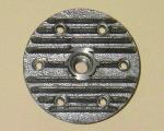 The combustion chamber is cast into the underside of the head, the plug being set at a very slight angle off the vertical. The plans specified this angle as 8 degrees, and my example closely matches this figure. The only effect of this angle is to cause the interior entry point of the centrally-mounted plug to be displaced a little to the transfer side of the combustion chamber, and that was presumably the intent of this rather unusual feature. The front view of the engine shows this angle clearly. The casting would seemingly have accommodated a vertical plug orientation, and it's possible that some individual builders might have adopted such an arrangement.