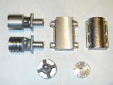 The two cylinder castings are mirror-image to facilitate fitting of the T-shaped inlet manifold which was retained by a slit clamp in the cylinder casting. The manifold was fabricated by soldering the inlet into a drilled cross piece. A conventional design spraybar was also soldered up as part of the assembly. The needle valve made use of a small 0.030" sewing needle--a sound practice since followed by many, many small and not so small production run engines (Taipans and Glow-Chief, for example).