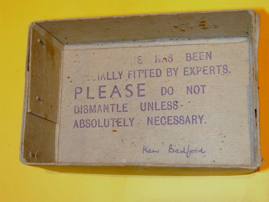 When introduced, the Mk I ETA 29 was quoted as delivering 0.54 bhp @ 14000 rpm. This performance continually improved with the 6/6C producing 0.82 bhp @ 17000 rpm. In England and Australia, this was THE engine to have in your "B" Class Team Racer.Van's engine has been run and flown in a control-liner (a Mike Ware "Carioca" published in the Dec/Jan 1957 issue of Australian Model News) but is original in all respects and he has respected to this very day the strong warning stamped by an unknown hand inside the box top that bears the designer's signature. Now, a quiz: there was an cuckoo in the nest when Van took the box contents photo, and one piece of the documentation is not from Eta Instruments. For 1 point, which piece is it? For an extra 4 points, who is it from? NB that 5 points and $3.40 will buy you a cup of coffee. Hover here for the answer.