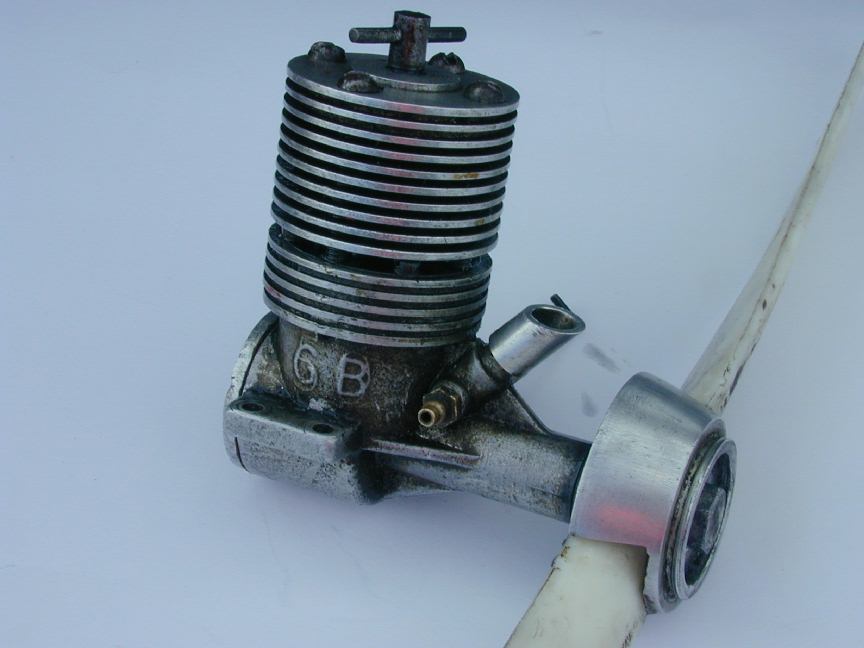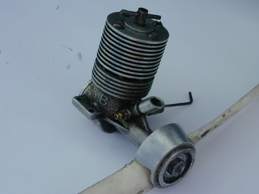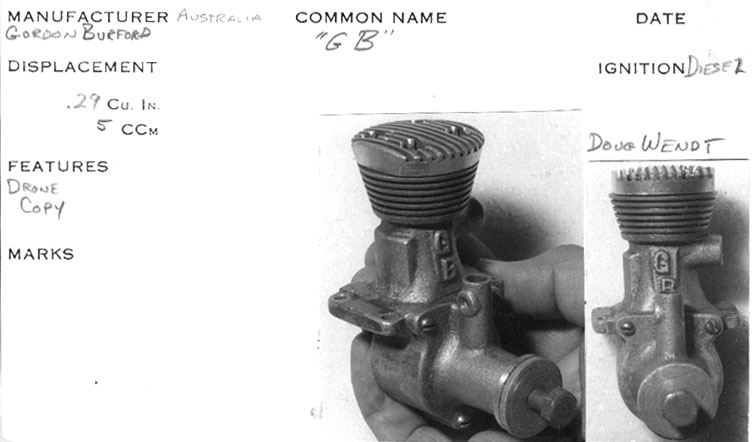 Gordon Burford is Australia's most well known and prolific engine designer and builder. The engine pictured here is one of his first mass produced engines. Chronologically, it fits between the "Drone" (aka GB Stuntmota) style engines and the first Sabre. Appearance wise, it bears features of the English Yulon series in the "beehive" shape of the head and finning above and below the exhaust ports. However, the Yulons (29, 30 and 49) all used "updraft" intakes and nearly all had a series of small diameter holes for the exhaust. The GB50 has more conventional down-draft intake and slotted exhaust. The liner is secured to the case with four short round head screws (look closely in the exhaust band). The head is then secured with four long screws spaced between the short ones. The backplate has two holes in its rim to accommodate a "pin" spanner, unlike Gordon's later engines which used the more conventional "penny" slot arrangement. It's also worth noting that Gordon always referred to his early motors as "GB". The Gee Bee moniker came from the advertising of his somewhat unethical agent and resulted in the name change to Sabre, but that's another, longer, sadder story.