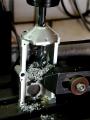 The brass lock pin that retains the carburettor (Photo #5) was first turned with a flange as seen in Photo #3. This enabled it to be clamped up tight while the carby bore was drilled (Photo #4), thus forming the concave locking cut-out. The flange was then turned away. All this is a standard locking pin fabrication trick described by George H Thomas in his dividing and graduating book (reprints of Model Engineer articles from the late 1970's). I find time and again that study of non engine-making techniques can be applied to otherwise tricky problems, and that's part of the enjoyment of this hobby.