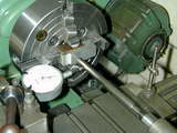 - Layout comprises 5 scribed lines; the first close to what will be the bottom of the case. The remainder are measured from this at 3/8", 3/4", 1-1/4", and 1-21/32". A center-pop mark is then made in the middle of the block on the second line and the block setup in the 4 jaw chuck with a "wobbler" to get the block to run true. It's important that the blind bore we're about to make is at 90° to the axis of the block so that the crankshaft and cylinder are correctly aligned for minimum operating friction. In this photo, I've reversed two of the chuck jaws and pressed the bar firmly back onto the jaw faces to achieve this. Be careful when you do this that you can still drill through the centered block for the rotor pin and not hit the reversed jaws!
