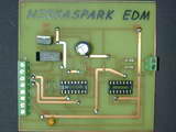 This two-sided PCB was made by Nick using a CAD layout program and printing the positive image of the lands onto photo-quality paper in his laser printer. The paper and printer toner were then ironed onto the copper-clad board, fusing the toner to the copper. Next, the board with attached paper immersed in hot water. This softes the paper which can be pealed off leaving the toner behind as the etch-resist. The Nikkaspark EDM trade-mark
