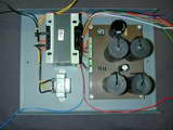 The front panel holds a meter that reads the generator output voltage, a variable resistor ("pot") that provides a reference voltage to the comparator which controls the servo motor driver chip, and some associated switches and connectors. Referring to the front view of the front panel, the momentary contact (push-button) switches in the top left will instantly drive the servo up or down. The red switches at the bottom select additional capacitors for faster but rougher cutting. The black switch enables drive to the servo. A dual color Light emitting diode (LED) between the push buttons indicates servo drive direction. Another single color (red) LED between the meter and spark lead connector terminals at the lower right provides power-on indication. The connector on the left is for the ram servo motor. It only requires two wires, but I've used a four pin connector in case I decide to add a limit switch feature later on. Having used the unit, I'd now say the meter is completely unnecessary, even if it does add a very *pro* look.