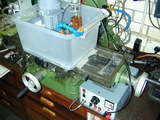 Here we are ready for the first trial burn. The tank is clamped to the mill table. The ram is held in the mill quill and lowest gearing selected to prevent the quill rotating (my joke of a mill has no anti-rotation clamp). Power has been removed from the mill, and the shop fire extinguisher is within easy reach. First the electrolyte delivery system needs to be tested. The tank is filled to a depth that covers the rather large base of the suds-pump and power applied.