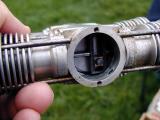 Examine the photo on the right and you can see how one cylinder looks like what we'd expect to see in a 2 stroke side port: inlet opening with the piston just before TDC and exhause opening just before BDC. Normally in a side-port design, all timing is symetrical about BDC and TDC (which is why they will run equally well in either direction), but on this beast, since the crankshaft/conrod geometry mandates that one piston must lag the other, transfer will not occur symmetrically with exhaust. Optimally, the exhaust would be fully open when transfer occurs, so the inrush of the new charge will assist to force out the remainder of the burnt gasses and the exhaust will close before the new charge get a chance to rush up one chimney, down the other and escape. So we should get better scavenging efficiency, with only some mixing of old and new charges in the transfer cylinder. Full size 2 stroke diesels built on this principle induct only supercharged air, with fuel being injected when this air has been compressed, hence their scavenging is just about as good as it gets.