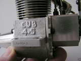By observation, it is a spark ignition, overhead valve, four-stroke based on a simple sand-cast crankcase. We don't know the capacity. It might be 4.5cc, but that designation below the "CUB" looks more like "4.S" for "Four Stroke" to me. The new owner has been told that perhaps ten or more were made, but nobody seems to know by whom, or if this is true. Let us know if you can shed some light.