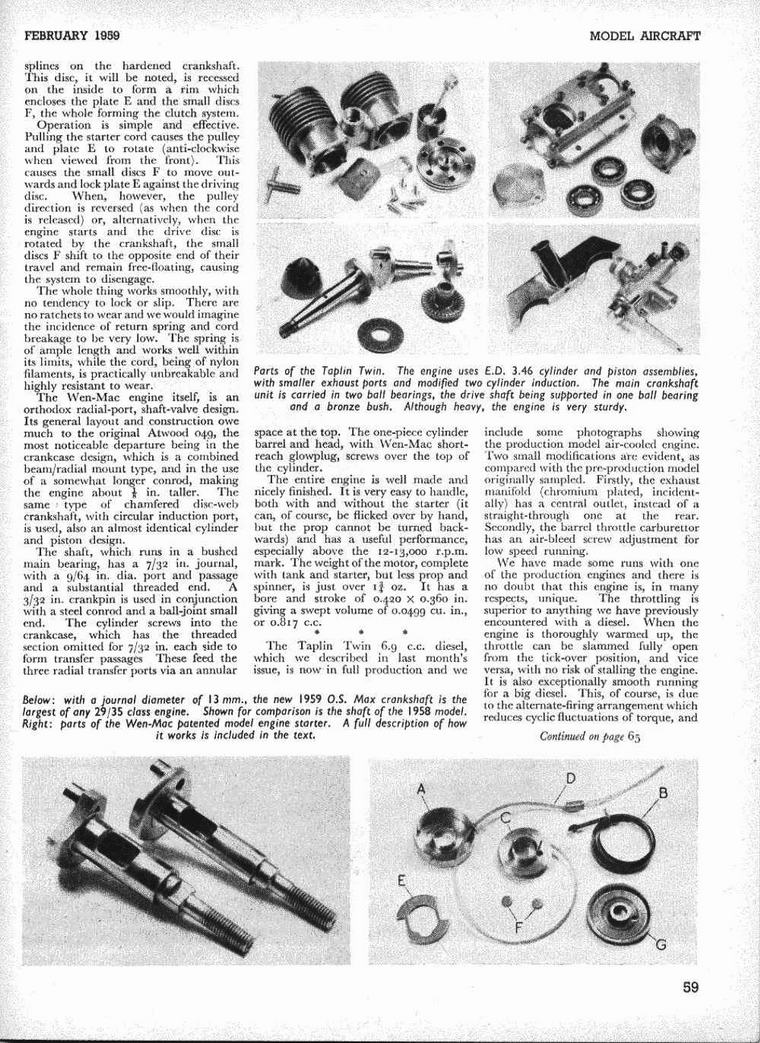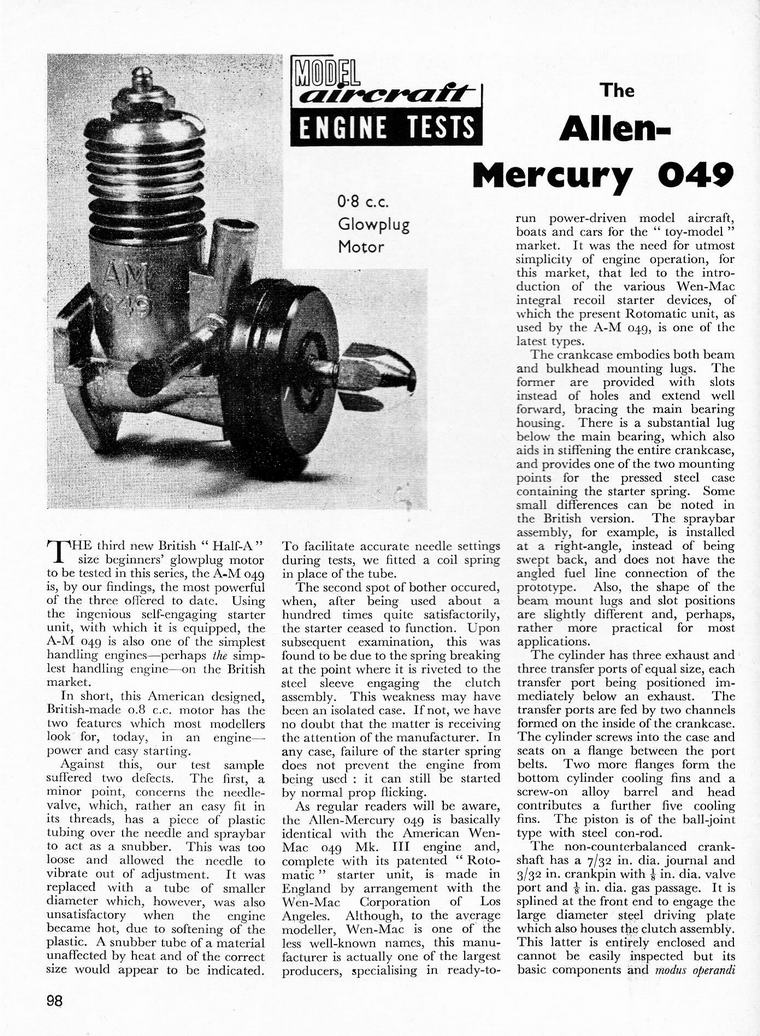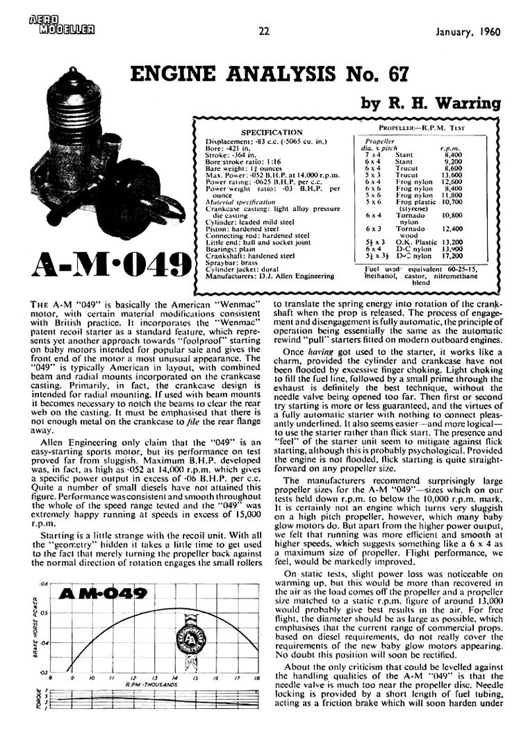 A further test of the A-M .049 by Peter Chinn appeared in the April 1960 issue of Model Aircraft. Chinn again stated quite clearly that the engine was "made in England by arrangement with the Wen-Mac Corporation of Los Angeles". He was quite impressed with the engine, although he too criticised the use of plastic tubing to tension the needle valve and also had trouble with the starter, the spring of which failed in the manner described above after only about 100 uses!