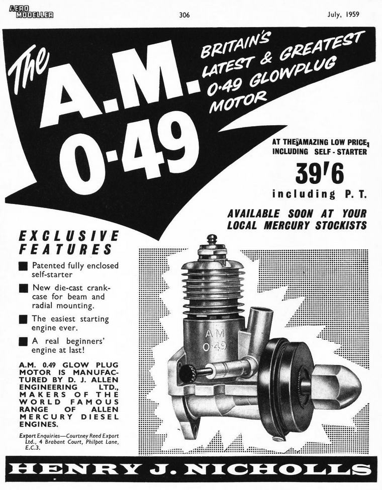 The A-M .049 was announced in a full-page advertisement which appeared in the July 1959 issue of Aeromodeller. The ad stated that the engine would be available "soon". As events proved, examples actually began to appear in the model shops in late September 1959, by which time the engine was appearing in Allen-Mercury's regular advertising. It sold for a most competitive price of £1 19s 6d, although this was soon to be undercut by the D-C Bantam at only £1 14s 6d.