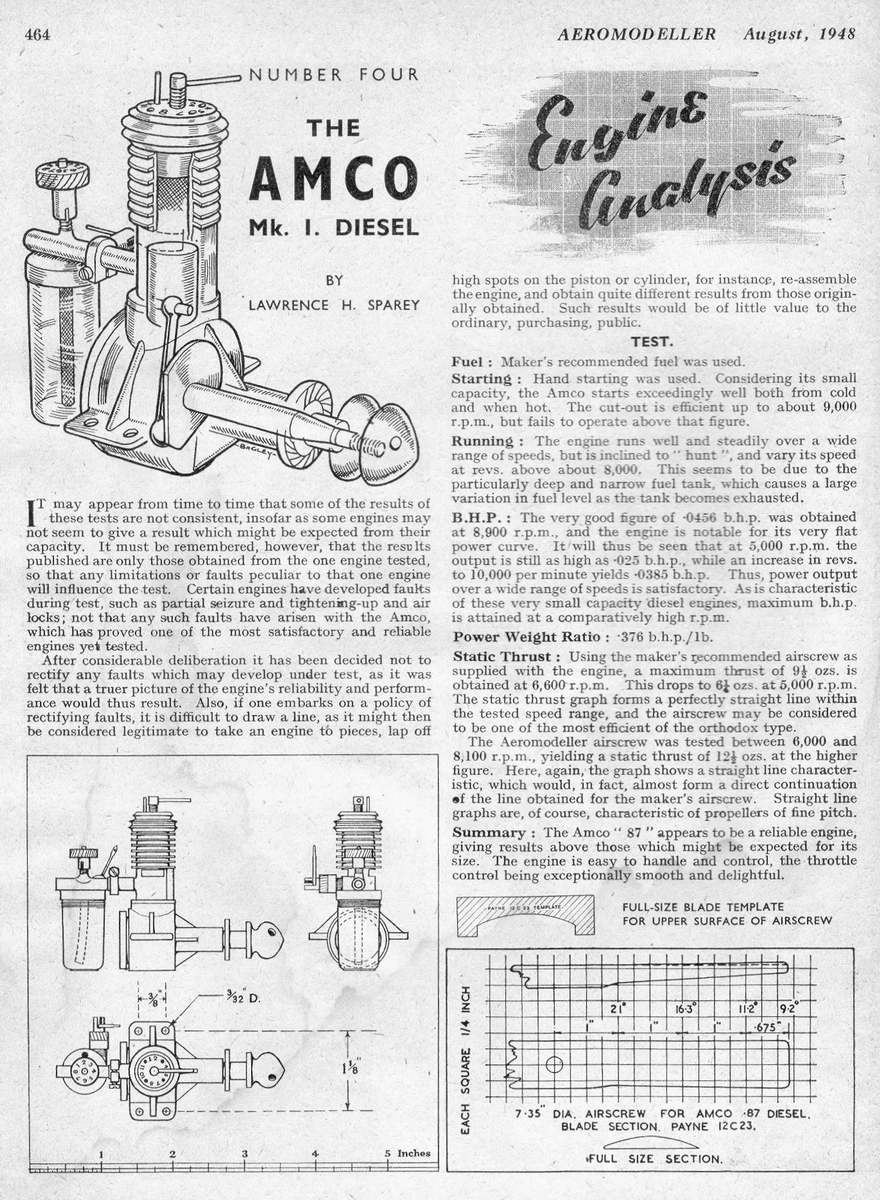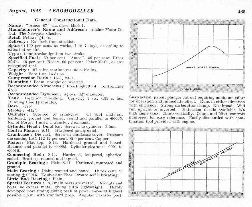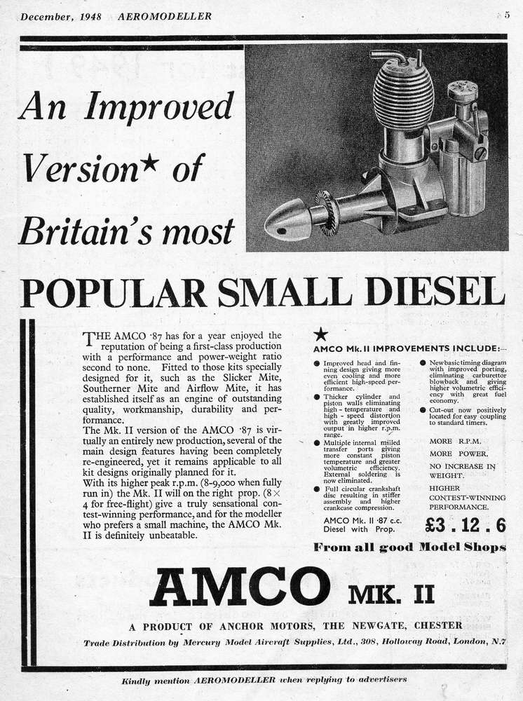 The Amco 87 was introduced in August of 1947 and was the initial offering from the Anchor Motor Co. of Chester, Cheshire, England. With a bore and stroke of 0.375" and 0.481" respectively (9.52mm and 12.22mm), it was a typical long-stroke side-port design of its day. Displacement, as the name suggests, was 0.87cc (0.53 cuin).