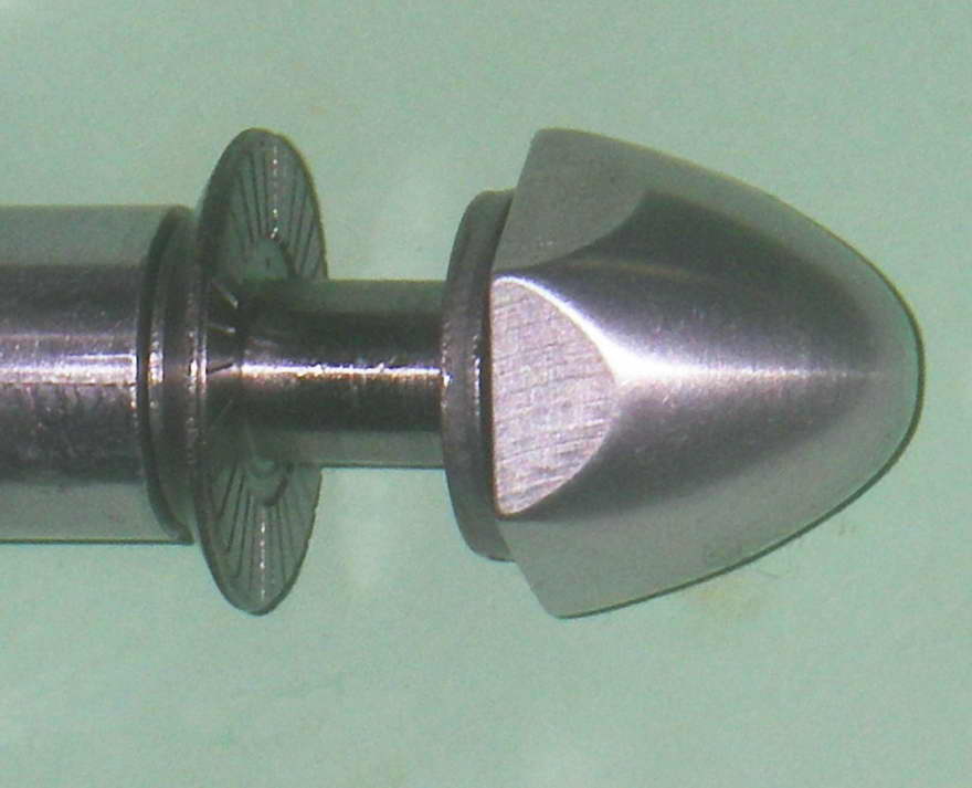 But perhaps we should thank this unknown butcher, because one very useful thing that I did learn as a result of this enforced restoration effort was the method of securing the pressed-in "head button" which seals the bore. This is another point which has been debated over the years, and now it's sussed out! You have to look very closely to see this, but after the bore was finished internally (except perhaps for the final lapping), the flanged "head button" (blind-drilled and tapped from the top for the comp screw) was press-fitted into the top of the cylinder and staked in place with two thin ( 1/16 inch diameter) piano-wire or silver steel dowels which are a very close fit (probably a press-fit) in a pair of holes drilled diametrically through the cylinder wall into the "head button" on diametrically-opposing sides, presumably after the fitting of the button. The subtle part is that these holes stop short of breaking through into the threaded hole provided for the compression screw. The final external finishing of the cylinder was done after this set-up was installed, and the very close fit of the dowels in their holes plus the fact that their outer ends are finished flush with the cylinder surface makes it very difficult indeed to see the evidence once that has been done! But it's effective—once those stakes are in place, that "head button" isn't going anywhere, as I learned the hard way!