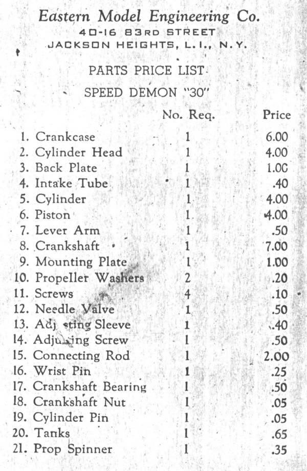 The January 1948 write-up by Ingram on the then-new Speed Demon is quite informative. It confirms that the engine was manufactured in the USA by the Eastern Model Engineering Co and was entering the market after "...about a year of experimental and design work". This comment is interesting insofar as it begs the question of what the makers were doing in order to eat while they did this work. In fact, this comment strongly suggests that the Speed Demon was most likely the product of a one or two-man "small workshop" operation like many small producers in Britain at the time. The very low production figures for the engine are certainly consistent with this scenario. The avoidance of the use of castings as well as the very high quality of construction both suggest a "model engineering" background in keeping with the company's name.