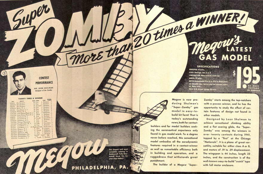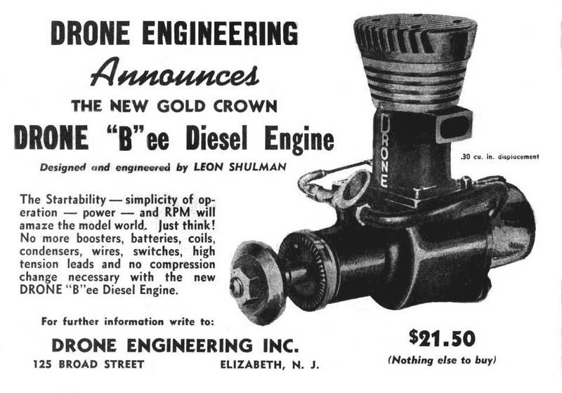 The Drone Diesel was designed by the well-known modeller Leon Shulman, who had been born in 1920 in Brooklyn, New York. Although he was only 26 years old when the Drone was conceived, Leon was already a very experienced modeller with a high standing in the US competition arena and a visible presence in the US model trade. He had actually taken his first step towards an active involvement in the model industry in 1940 at the age of only 20, when he developed and marketed a folding prop for gas models. In 1941 he followed this up by marketing an "unbreakable" plastic prop. In addition, a number of his free flight model designs such as the Sky Scraper, Sky Rocket, Wedgy, Banshee, Zoomer and Zomby enjoyed considerable competition success both in America and elsewhere, and most of them were either commercially kitted or published in plan form.