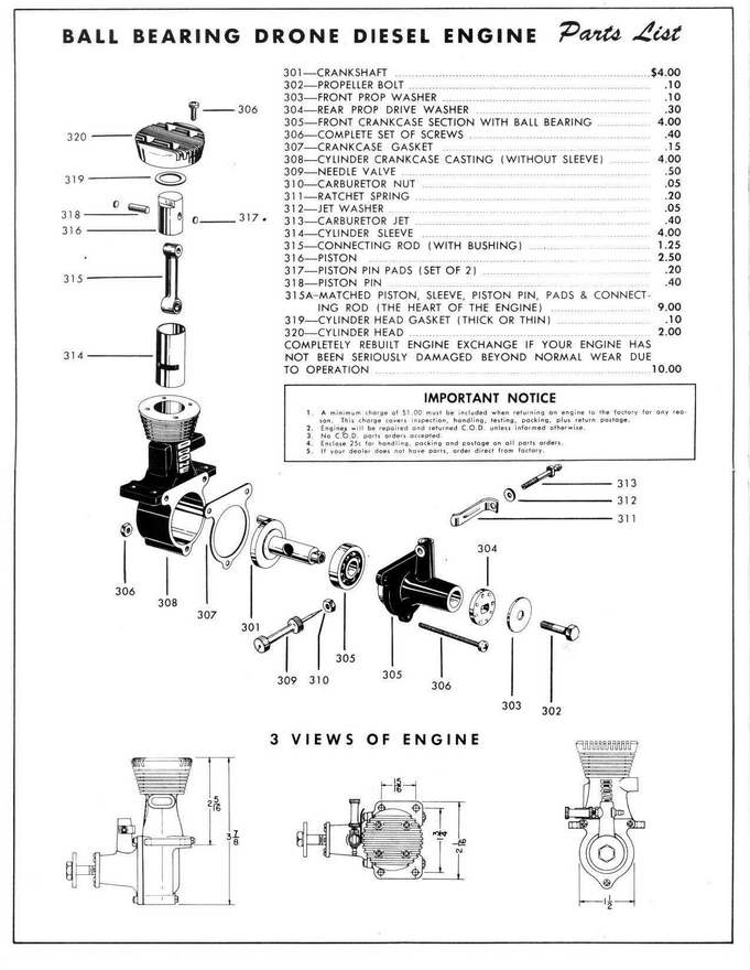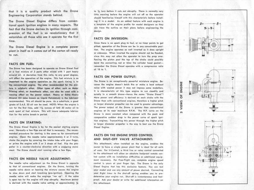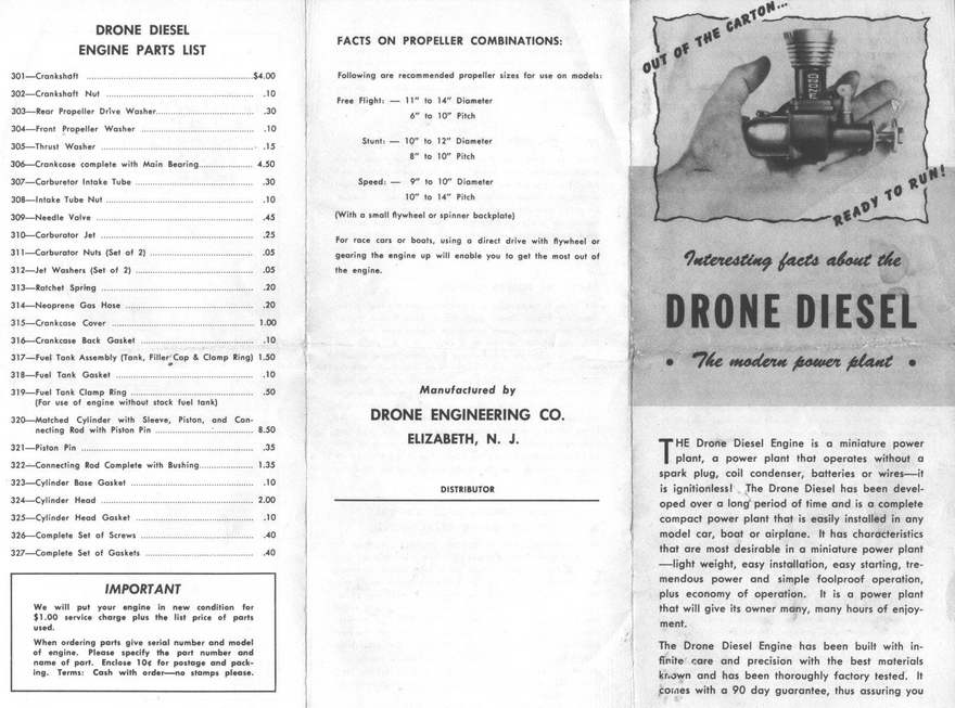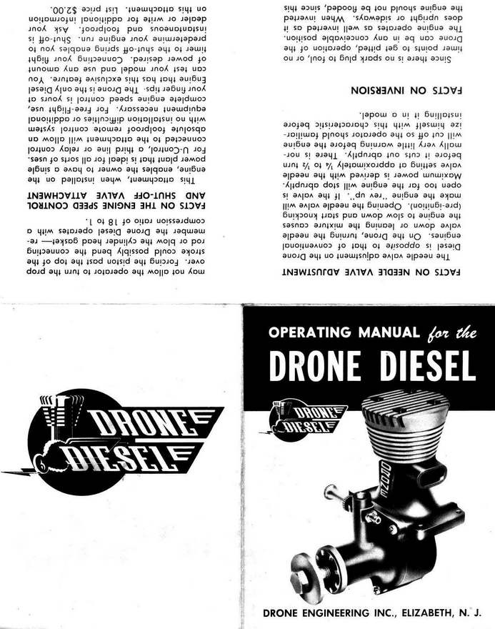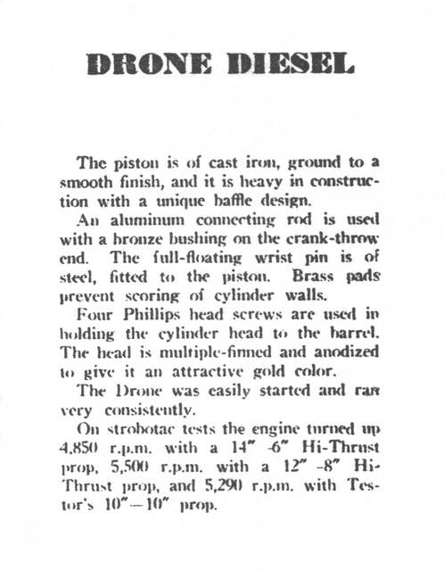 The September 1947 issue of "Air Trails and Science Frontiers" featured an article by Jim Noonan entitled "The Development of Diesels", in which the Drone received high praise for its "high speed, smooth running and lots of noise"! The latter comment was somewhat contradictory to the claim in the factory instruction leaflet, which implied that the engine was unusually quiet! Based on present-day testing, it was in fact somewhat quieter than the spark ignition competition.