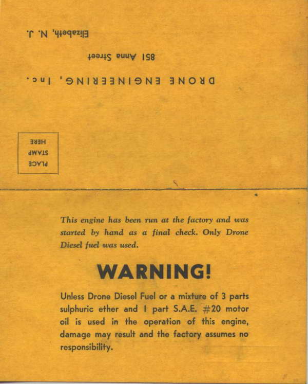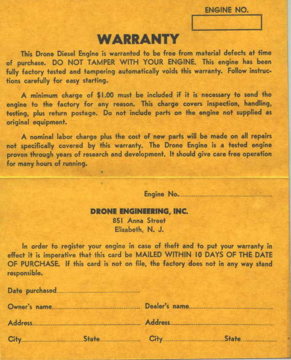 Basically, Drone Engineering guaranteed that the buyer received an engine that had been tested and found to be in perfect working order and was therefore capable of performing up to standard as supplied. The company clearly felt that this was the extent of their obligation and that what happened thereafter was up to the new owner! The guarantee warned that dismantling the engine or using a non-specified fuel invalidated the guarantee.