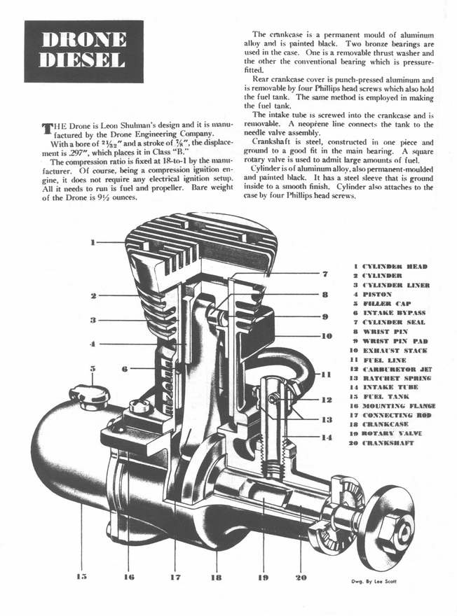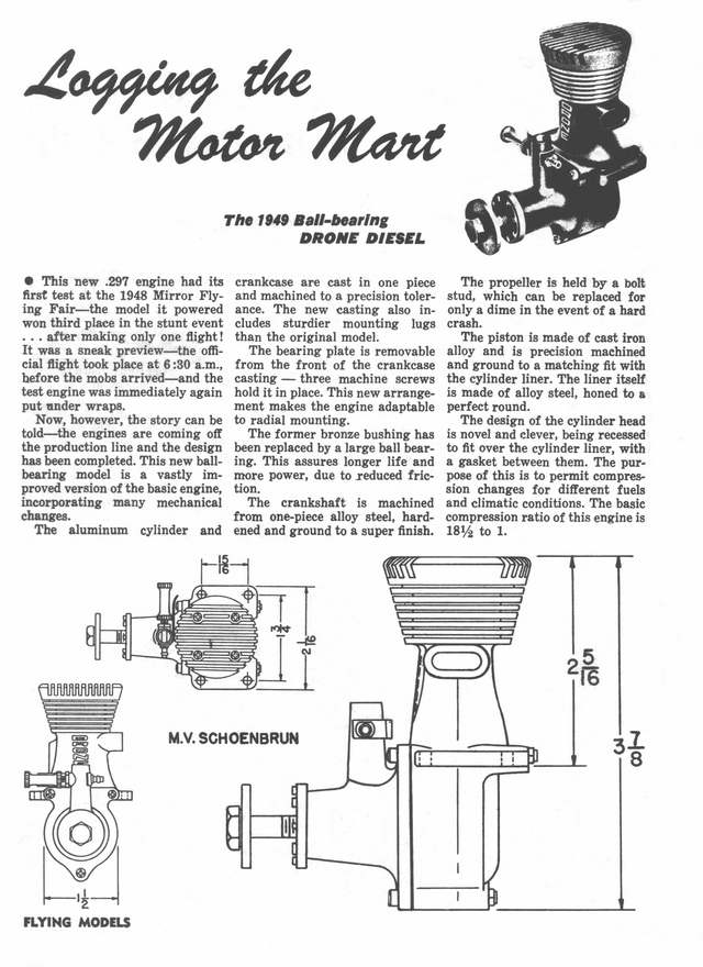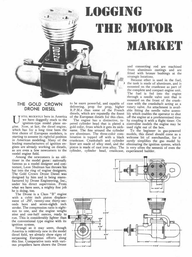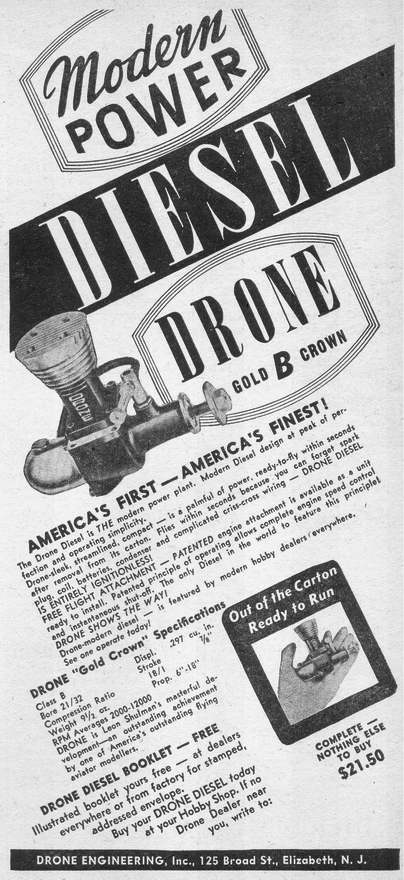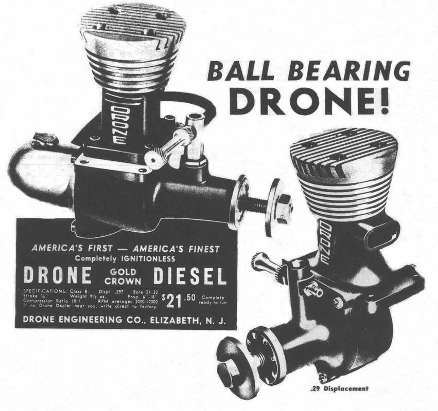 As of the mid 1940's, spark ignition engines were dominant in American aeromodelling and the model diesel technology which had been evolving in Europe since 1941 was pretty much unknown. However, this began to change shortly after the conclusion of WW2 when returning US servicemen started bringing European diesels back home with them in increasing numbers. One of these was the French Micron fixed-compression diesel of 4.99 cc displacement, examples of which had begun to appear on American flying fields by 1946. It was this engine which inspired the design of the Drone Diesel which is the subject of this article.