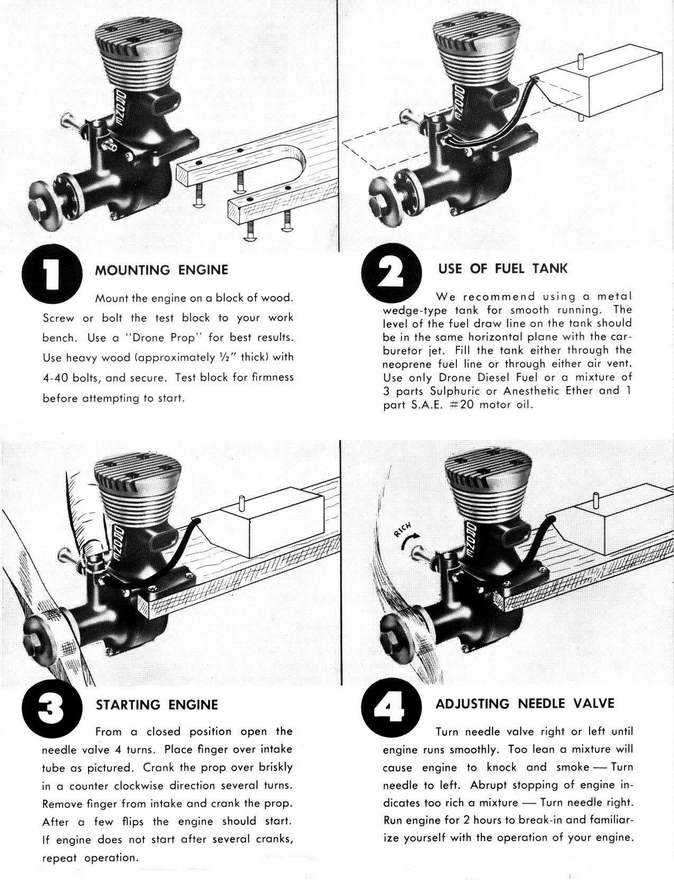 The manufacturer's recommended fuel consisting of 75% ether and 25% mineral oil works well. The manufacturers recommended straight SAE 20 oil, but I've found that 20/50 mineral-based motor oil works just fine and probably improves cylinder lubrication due to its ability to polymerize to a higher viscosity at elevated temperatures. Straight SAE 30 mineral-based oil also seems perfectly satisfactory. The engines are very clean-running on this fuel—no castor gum to worry about!