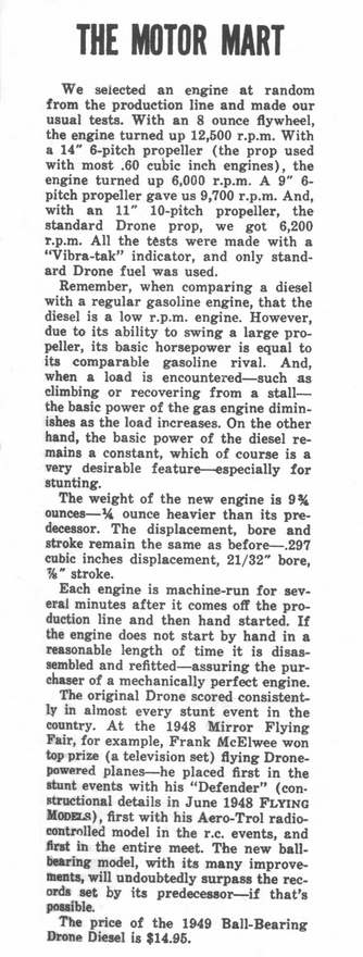 In addition, a contemporary user's view of the Drone appeared in the December 1947 issue of "Model Airplane News". Author Jack Bayha commented as follows: