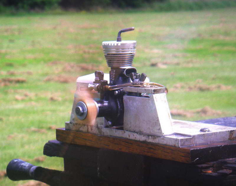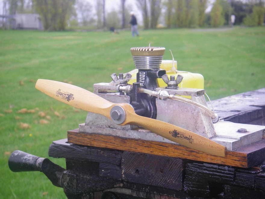 The first model Drone seems to run very smoothly in the 5500—7500 rpm range, but starts to struggle with under-compression above that range, even when well warmed up. One contemporary tester reportedly rated it at 8,400 rpm on a 9 x 4 wooden prop and 4,400 rpm on a 14 x 8. The 9 x 4 is definitely operating past the engine's peak, which is probably around 0.2 BHP in the region of 6,500 rpm or so, and the 14 x 8 is unquestionably lugging the engine—a very bad thing to do with a fixed-compression design since pre-ignition is almost certainly occurring in this state and nothing can be done to alleviate this while the engine is running. I obtain around 6,800 rpm on the bench on a 10 x 8 wood prop (somewhere around 0.19 BHP), and would recommend that or an 11 x 7 as a very suitable bench test prop for this engine.
