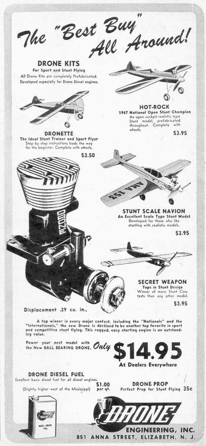 In view of all this promotional activity, it should come as no surprise to learn that the Drone quickly achieved a high level of acceptance among control-line stunt flyers, and users of this engine cleaned up at major stunt contests in America during the year of its introduction. The 1947 US Nationals and the prestigious Mirror Meet both fell to the Drone, along with numerous other lesser contests. The factory was kept busy keeping up with demand, and life was good!
