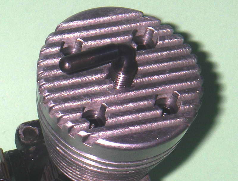 The genuine Drone glow heads were simply standard 1st model heads which had a centrally-tapped and smoothly contoured recess added to accept a standard glow plug. They also incorporated an internally-machined groove surrounding the glow plug hole in order to lower the compression ratio. The resulting combustion chamber configuration could scarcely have encouraged efficient combustion, however the engines did apparently run reasonably well in this form. Thanks go out to Bob Allan for the attached image of an original example of one of these heads.