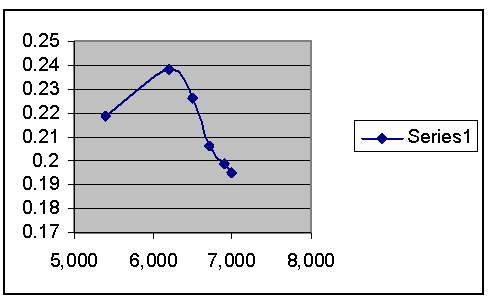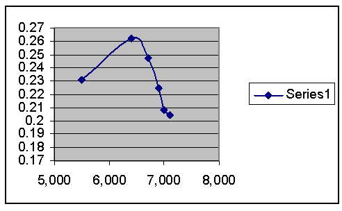 As can be seen, the variable-compression Drone produced a peak output of some 0.265 BHP @ 6,500 rpm. The fact that the compression can be optimised at all speeds results in the engine being limited by its induction and transfer systems rather than by the compression ratio in combination with the other factors. It appears that the engine's pumping efficiency is at its maximum at around 6,500 rpm, which explains the fact that the peak is found at that speed using variable compression. The higher-energy fuel also doubtless played a part in achieving this result.