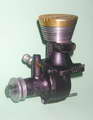 The model that finally reached the marketplace in early 1947 is generally referred to as the first model Drone, or the Drone plain-bearing model if you prefer. It was basically similar to the design illustrated in the early advertisement, but the cast-on word "Drone" was moved from the front of the bolt-on cylinder barrel casting to the bypass bulge opposite the exhaust. In addition, the original cast-in-unit venturi was replaced by a separate screw-in item which could be positioned to set the needle in any desired orientation using a lock-nut.