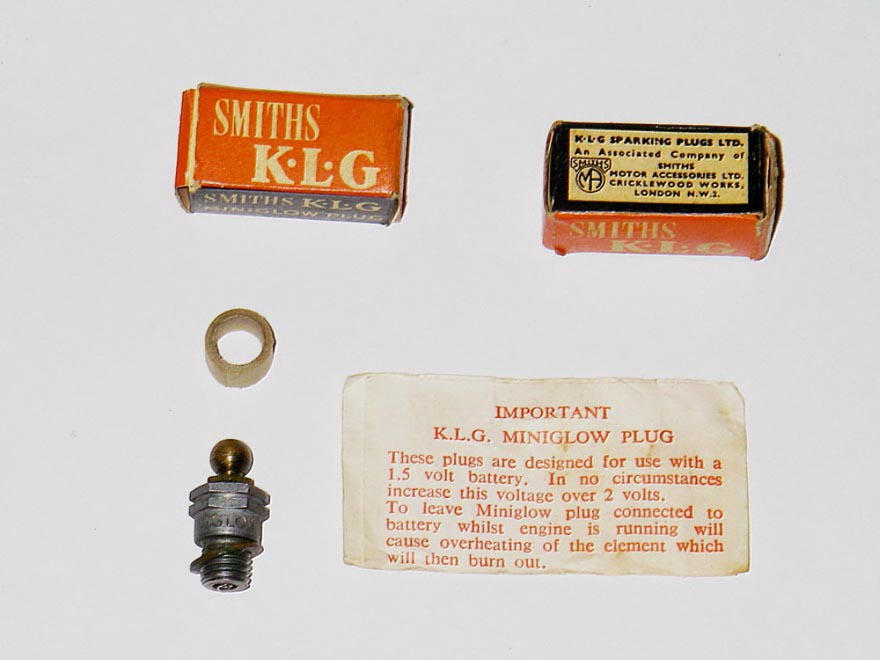ED had got the ball rolling by quickly developing a glow-plug conversion kit which was supplied with their 2.49 cc Mk III FRV diesel engine introduced in March 1948. Soon thereafter, Nordec created quite a stir with the glow-plug version of their 10 cc spark ignition racing engine. In addition, a number of British modellers somehow contrived to obtain glow-plugs from across the Atlantic and began to use their old spark ignition engines with the new form of ignition. This in turn prompted a number of British accessory manufacturers to commence the production of miniature glow-plugs for model engines. The most notable of these was the firm of Smith's Motor Accessories Ltd, who found it worthwhile in mid 1948 to have their subsidiary K.L.G. Sparking Plugs Ltd begin production of the famous Arden-influenced ball-headed "Miniglow" plugs in various sizes.