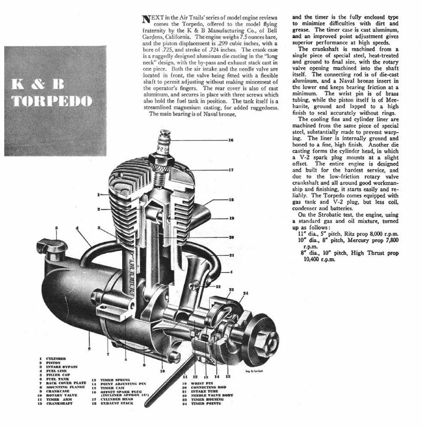 The K&B Torpedo 29 spark ignition model which was in production at the time in question was a development of the original K&B Torpedo "B" model which had been the first design introduced by the K&B Manufacturing Co. of Bell Gardens, California. The K&B Torpedo "B" sparker first appeared in July 1946. By March 1947 this model had passed through several relatively minor design iterations as well as a name change to the K&B Torpedo 29. It was this updated spark ignition model which would have been available to IMA to serve as their original design inspiration as of early 1948.