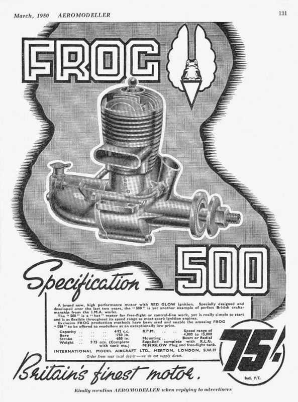 A degree of ambiguity has previously surrounded the date of the FROG 500's initial appearance. As far as we've been able to determine, the first national advertisement for the new model appeared as a full-page placement by IMA in the March 1950 issue of Aeromodeller magazine. However, in a number of later articles Peter Chinn repeatedly and specifically referred to the engine as having been introduced in "late 1949", commenting upon its immediate acceptance by the British modelling public at that time. Chinn's dating on British engines was generally pretty reliable given his position as one of the recognized model engine commentators of his day as well as the fact that he was recording events which were then very recent. In addition, the release of this particular engine had clearly made a strong impression upon him. It thus appeared possible, albeit unproven, that the 500 was released in time for Christmas 1949 (an entirely logical objective) in advance of the preparation of a national advertising campaign relating to the engine. Perhaps IMA wanted to quietly test user reaction to their new offering through an unadvertised London-area release through dealers.