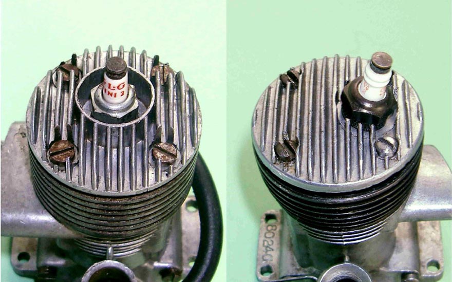 Finally, the vast majority of FROG 500's that have been used have "expanded" and/or cracked plug recess walls in the cylinder head. This is due to a previous owner's failure to obtain a socket which matches the plug and will fit inside the recess provided. The often-attempted use of pliers or an end-on crescent wrench pretty much guarantees such damage. Please avoid further damage, particularly if you have an undamaged example, by obtaining a suitable socket! Also, be sure not to over-tighten the plug in the short thread which is all that's available—the rather poor quality casting alloy used simply won't take it. A stripped thread can be restored using the appropriate 1/4-32 Helicoil kit, but it's far better to avoid having to go that route!