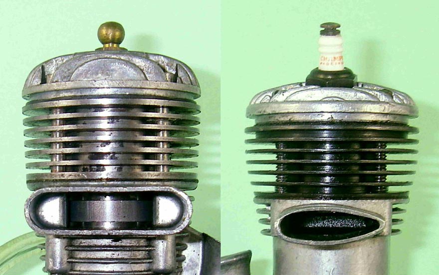 The next obvious departure was the cylinder head design. The FROG head was a considerably more massively-finned affair, although this had essentially no performance implications. Both models used a hemispherical combustion chamber with a transverse slot to accommodate the piston baffle at top dead centre. The only functional difference was in the plug location. The K&B had its plug element internally located to the exhaust side of the head, away from the piston baffle. To keep the inner end of the plug in the same plane as the domed combustion chamber surface at its point of entry, the plug was angled towards the exhaust side of the head as seen from the outside. By contrast, the FROG used a vertically-mounted plug in a central location.
