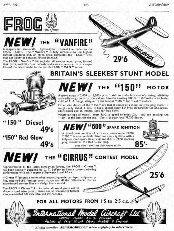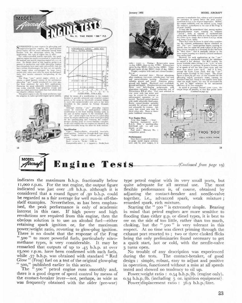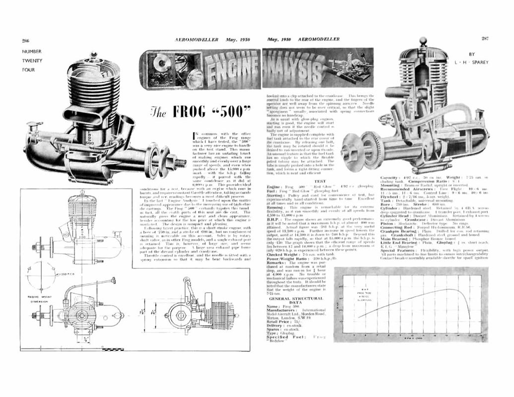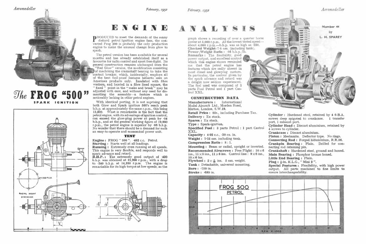 The competing Aeromodeller magazine did not lag far behind Chinn in getting to grips with the new model. Lawrence H. Sparey's test report on the FROG 500 PE made its appearance in the February 1952 issue of Aeromodeller only a month after the publication of Chinn's review.