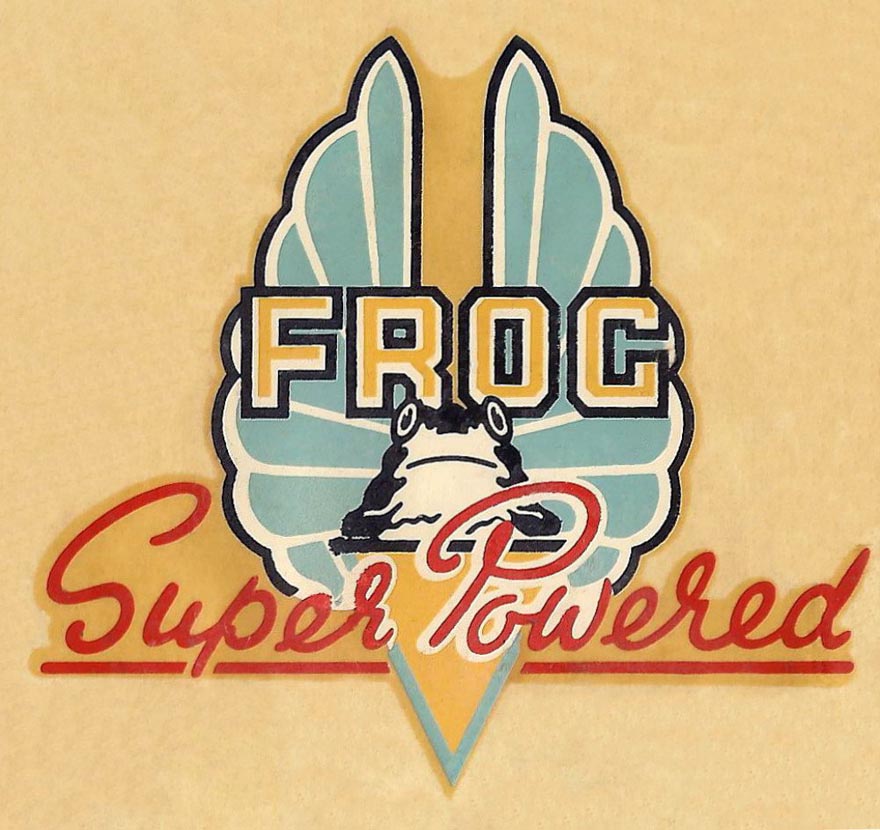 As of the late 1940's, IMA was already one of the world's oldest-established model aircraft manufacturers, having been founded in 1931 by Charles Wilmot and Joseph Mansour in association with Wilmot's brother John. The trade-name "FROG" ("Flies Right Off Ground") was used by IMA from the outset for their popular flying model kits, later being carried over to their engines as well. Note how cleverly the monograms of the founders (W and M, highlighted in colour in this image) were incorporated into their FROG logo ...