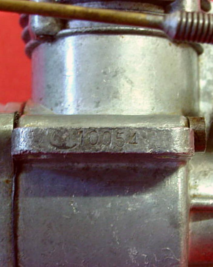 Earlier examples generally (but not invariably) displayed the number on the outer ends of the mounting lugs, while later products from around 16,000 onwards were always numbered on the case below the lugs. More significantly, all of the numbers for the original thin-lug model reported from various sources during the research stage of this study are evenly distributed within the 10,000 to 20,000 range. The statistically-reliable size of our quite large sample leaves no room for doubt that the sequence started at 10,000 and went on up from there without a break to around 20,000. At present, the highest serial number of my acquaintance for an example of this model appears on engine number 20,000 which remained in the possession of Bob Bright at the time of the previously-mentioned visit paid to him by David Owen and Gordon Burford in the year 2000.