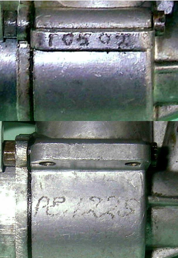 Interestingly enough, there appear to have been at least two distinct crankcase dies in use more or less from the outset. One die maintained the open finning of the upper crankcase at front and rear between the stack and the expansions for the transfer-side cylinder installation screws. The other die formed a casting in which the top cooling groove just below the casting's upper surface at front and rear was filled in. The groove remained open on the transfer side opposite the stack. The difference had no functional effect. My own engine number 10953 is the earliest example of my present acquaintance which displays the filled-in groove.