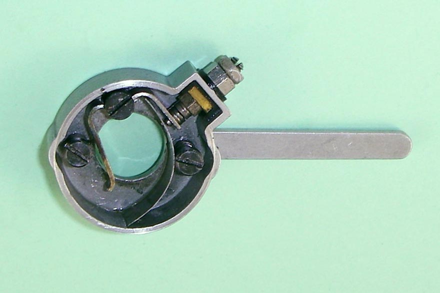 The tensioning of the timer against cam-induced rotation during operation was very neatly accommodated. A timer arm of flat dural alloy sheet had a crescent-shaped section at one end which engaged with an annular slot machined into the main bearing housing exterior just aft of the timer location. The timer was attached to this arm by two screws which passed freely through clearance holes in the rear of the timer housing to engage with tapped holes in the timer arm. These screws were internally tensioned by coil springs. In effect, this created a spring-loaded "sandwich" featuring a fixed raised lip of the main bearing housing set between the rear surface of the timer housing and the front surface of the timer arm. The latter two surfaces were of course constrained to move as one by the presence of the screws.