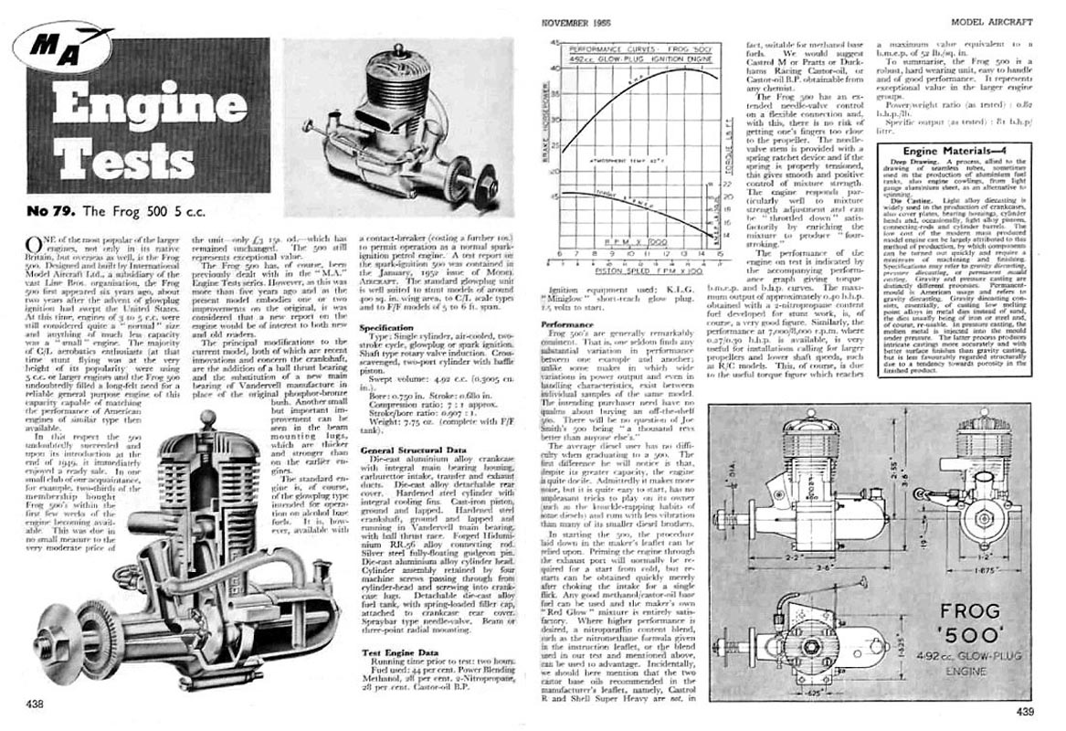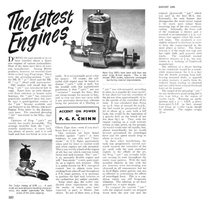 Prior to the publication of this article, it was widely assumed that the FROG 500 glow-plug model appeared in two basic models—the original version with a plain bearing and thin lugs and the final version announced in mid 1955 which featured thicker mounting lugs and a ball thrust race at the rear of the shaft. The main basis for this assumption has been Peter Chinn's announcement and detailed description of this model in his "Accent on Power" column in the August 1955 issue of Model Aircraft.