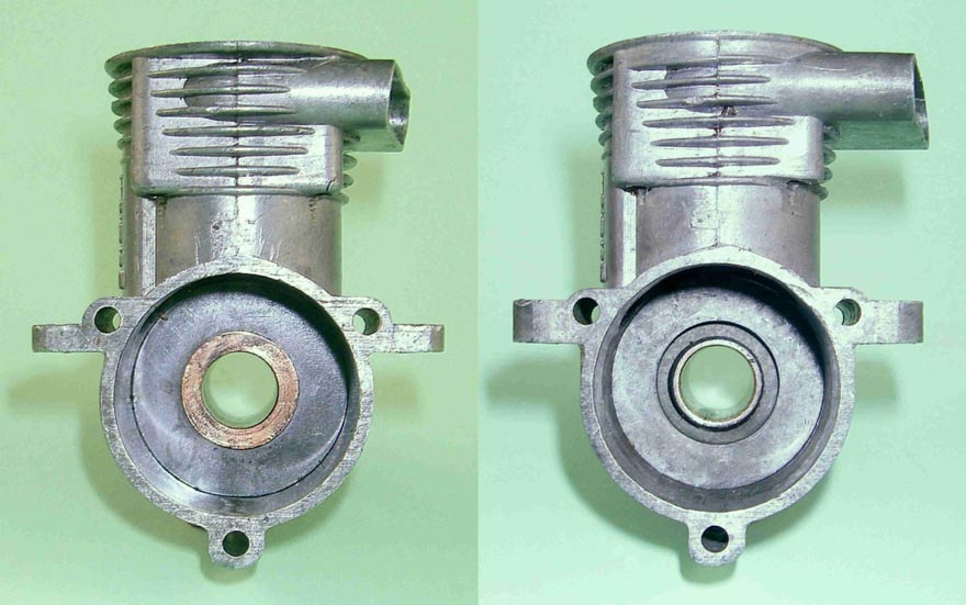 At first sight it might appear that rather than representing a design change, this could actually have been related to a material supply issue of the kind that IMA are known to have experienced from time to time. However, in his published test of the FROG 500 which appeared in the 1950 edition of the British periodical "Model Aviation" (see below), Peter Chinn stated that this change was actually prompted by the tendency of the cast iron bushing to seize when running light with inadequate cooling, conditions often encountered in model boat and car operation as well as cowled aircraft service.