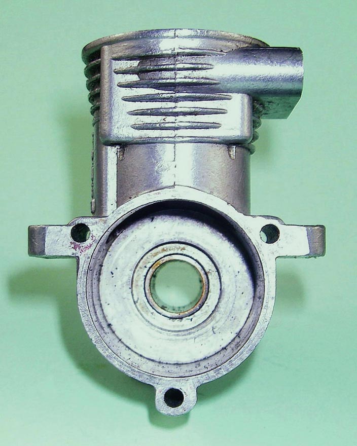 A difference in the material specification was initially to be found in the main bearing sleeve. Peter Chinn mentioned the fact that as originally released, the FROG 500 featured a machined cast iron sleeve as opposed to the bronze component used in the K&B. Jon Fletcher's very early engine number 10054 confirms this observation. However, the material of the FROG's main bearing was very quickly changed to machined phosphor bronze—my own early example number 10502 exhibits this change. This difference was thus extremely short-lived, apparently being confined to the first batch of 500 or so engines. This early version with the cast iron bushing is probably the least-common FROG 500 sub-variant today, although the difference is not externally apparent.