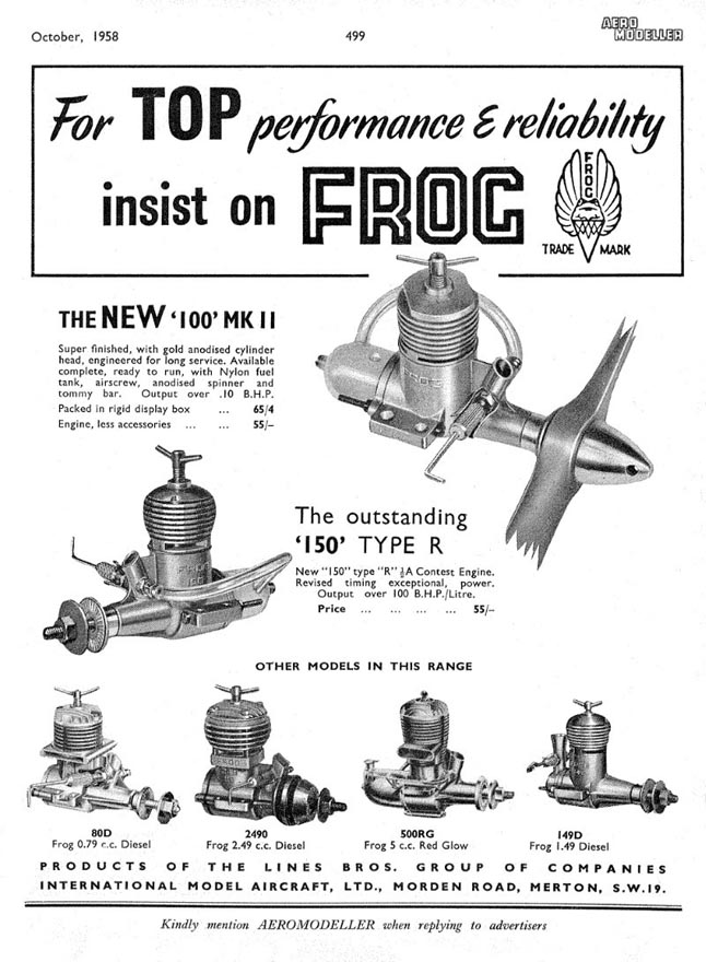 The first model engine design produced by the company was the FROG 175, a 1.75 cc spark ignition motor which appeared in early 1946. This competitively-priced unit was one of the first new commercial model engine designs to appear on the British market in the post-war period. It was soon followed by IMA's first diesel, the Frog 100, which first appeared in pre-production form later in 1946 and reached the market in quantity in early 1947.