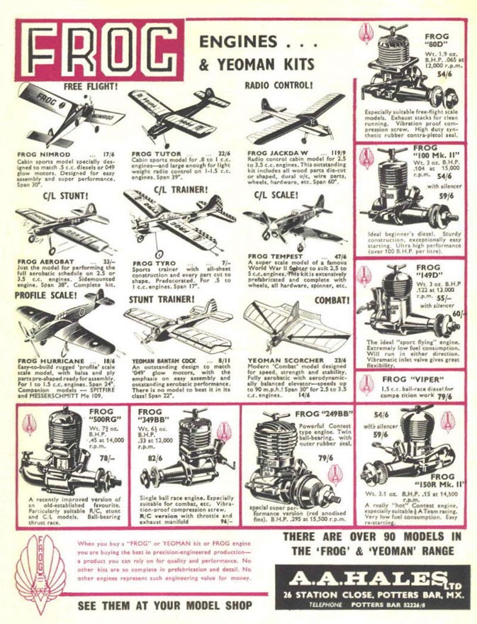 This was the final appearance of the FROG 500 in a published test. Ron Warring of Aeromodeller never got around to testing one of the revised models. Presumably he felt (with some justification) that the engine was yesterday's news by this time. As a design which very overtly harked back to the 1940's, the old 500 was undeniably beginning to look more than a little dated by the mid 1950's, particularly by comparison with the more up-to-date models from both America and Japan which were then beginning to appear in ever-increasing numbers on the British market.