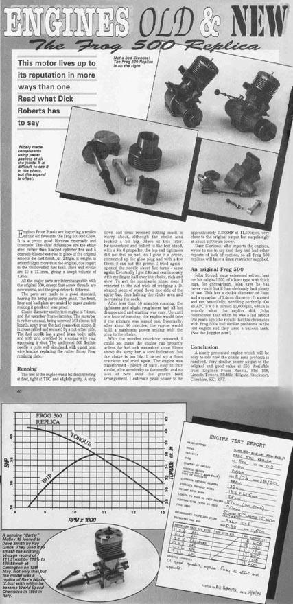 Apart from that, the test went well. With the restrictor in place, the engine started easily and ran just fine, with excellent needle response. Based upon the prop-rpm figures obtained, Dick estimated an output of around 0.38 BHP @ 11,500 rpm—very similar to the numbers reported years earlier by Peter Chinn for the original FROG 500. He also praised the quality of the engine's construction. Overall, he found it to be good value at its 1996 British selling price of £50.