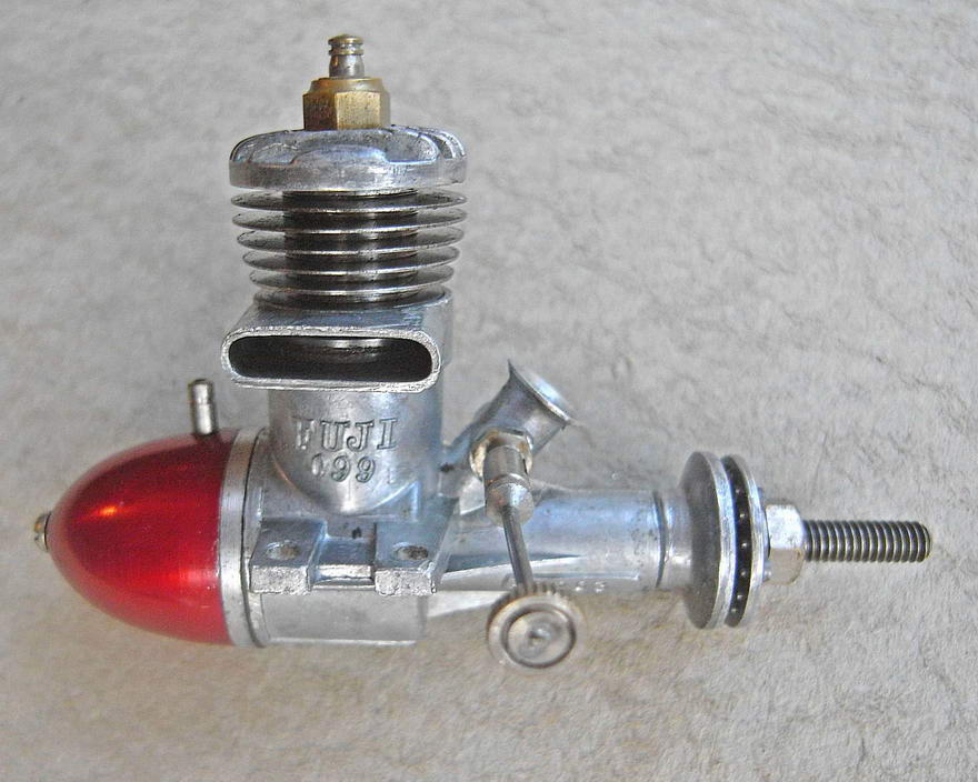 These engines were originally supplied as illustrated with a plain aluminium tank similar to that used on the companion 29 model. However, many examples encountered today have mistakenly been retro-fitted with the later red-anodized tanks that were to become something of a Fuji trademark with their .099 engines (and others) for many years. The Fuji .099 series were to retain their back tanks up to the early 1970's, long after practically all other manufacturers outside of Britain had discarded this once-common feature.