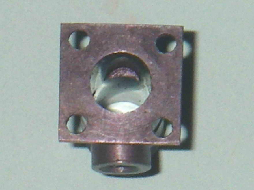 The cylinder was externally threaded at the top to accommodate the screw-on alloy cooling jacket and was provided with an integrally-formed flange of square planform located at its base. It was attached to the crankcase using four tiny screws which passed through holes in the corners of this flange to engage with tapped holes in the crankcase. Caution—do not tighten these screws unduly! The threads are prone to stripping and it's not necessary in any case. A gasket was used to ensure a good seal—always critical in any engine of this tiny size. The screw-in rear cover was also provided with a gasket.
